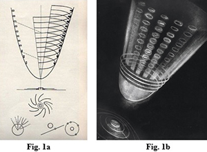 La tesi di laurea del cosmista neo-architetto Georgij Krutikov (1899-1958), discussa nel 1928, presenta un progetto dove la Terra non è più il luogo dell’abitare umano ma una infrastruttura produttiva, un suolo tornato vergine e adibito unicamente alla produzione agricola e industriale. Tutte le attività umane sono spostate in una costellazione di stazioni spaziali in orbita geostazionaria rispetto ai luoghi della produzione sulla superficie terrestre, ai quali sono collegati da navicelle monoposto. Tali città volanti sono energeticamente autosufficienti, grazie a un sistema a propulsione nucleare, e possono dunque colonizzare anche gli altri pianeti del sistema solare. L’insediamento produttivo sulla Terra è rappresentato come un sistema a spirale, il suo “doppio” al di là dell’atmosfera terrestre è invece un paraboloide che si sfrangia in una serie di piccoli cerchi radianti sovrapposti (Fig. 1a e 1b). Il carattere cosmologico del progetto è ribadito dal collegamento ombelicale tra i due insediamenti, un vero e proprio axis mundi, che può essere rescisso solo in direzione delle stelle, verso gli altri pianeti da colonizzare.