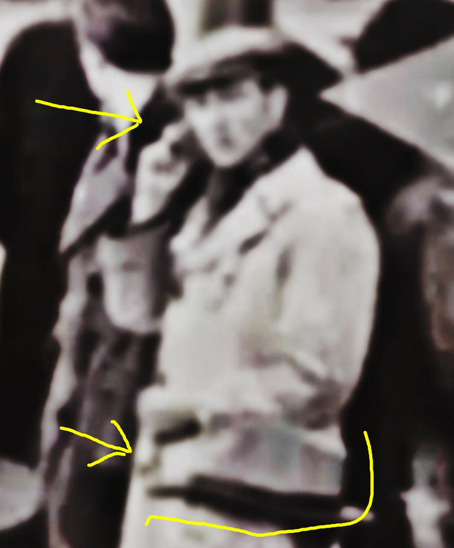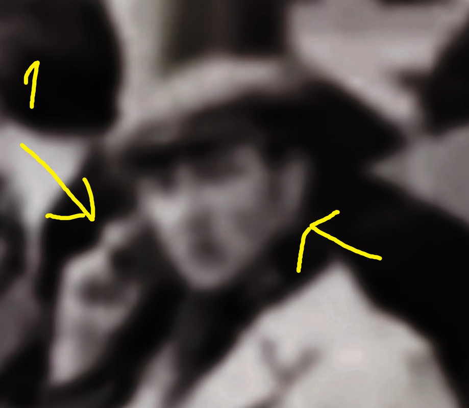 le frecce indicano lo strano oggetto che l'uomo tiene nascosto sotto l'impermeabile e l'altrettanto strano oggetto che tiene nella mano appoggiandolo all'orecchio